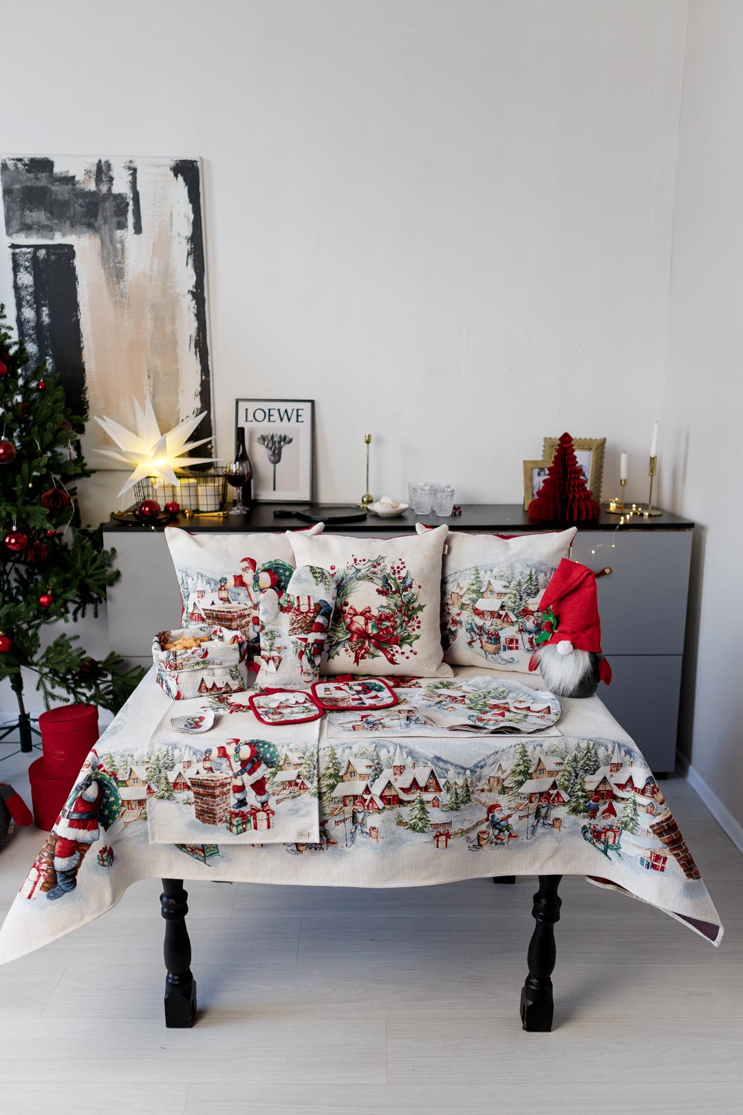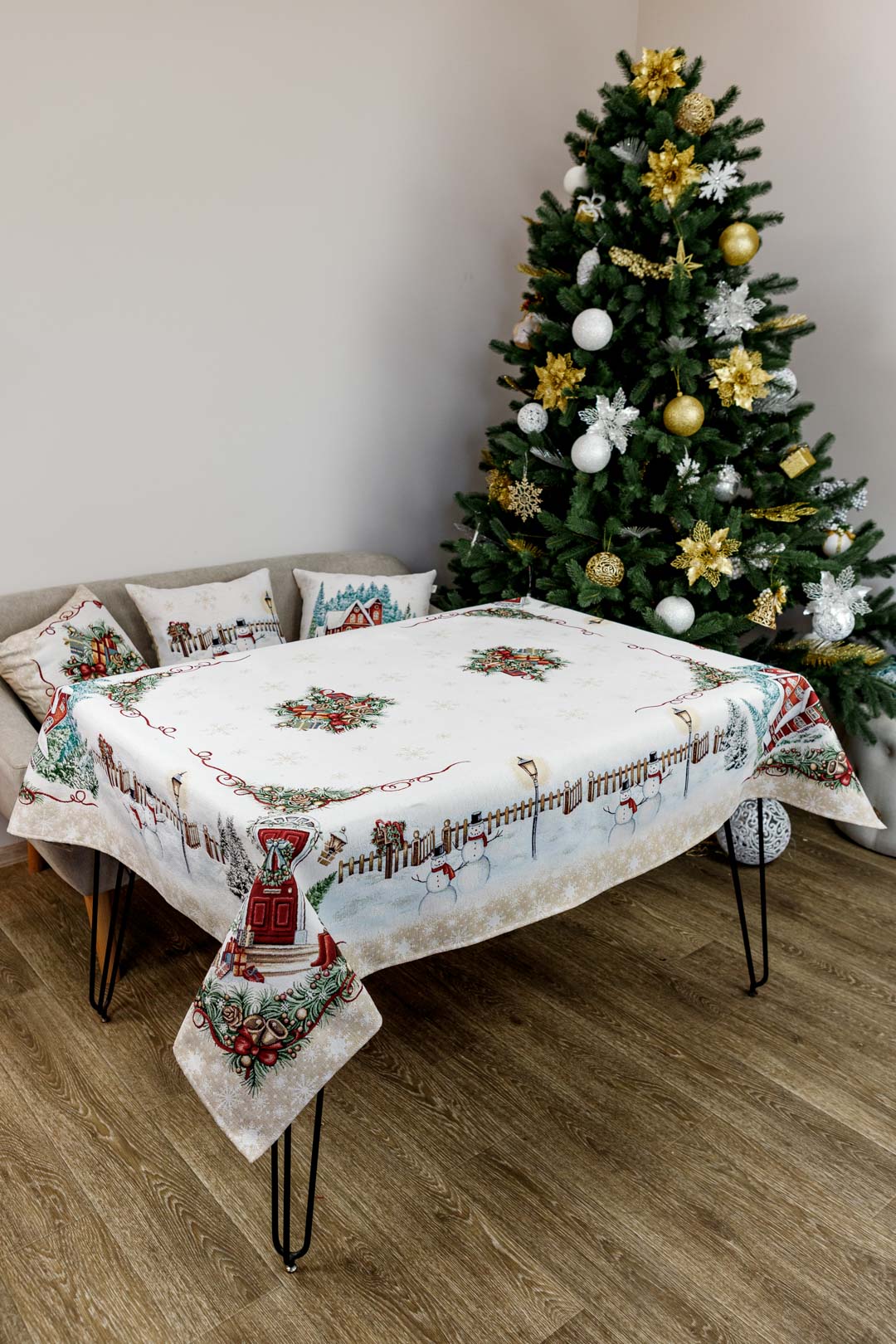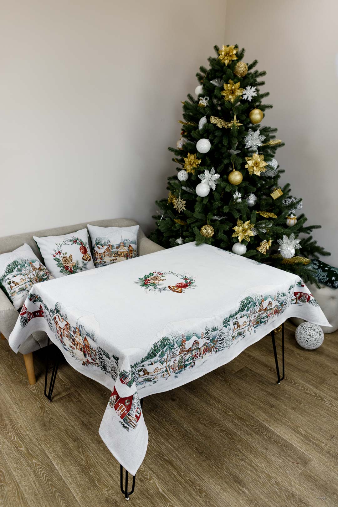 White Christmas Tapestry Winter Village: tablecloths, table runner, placemats, pillowcases