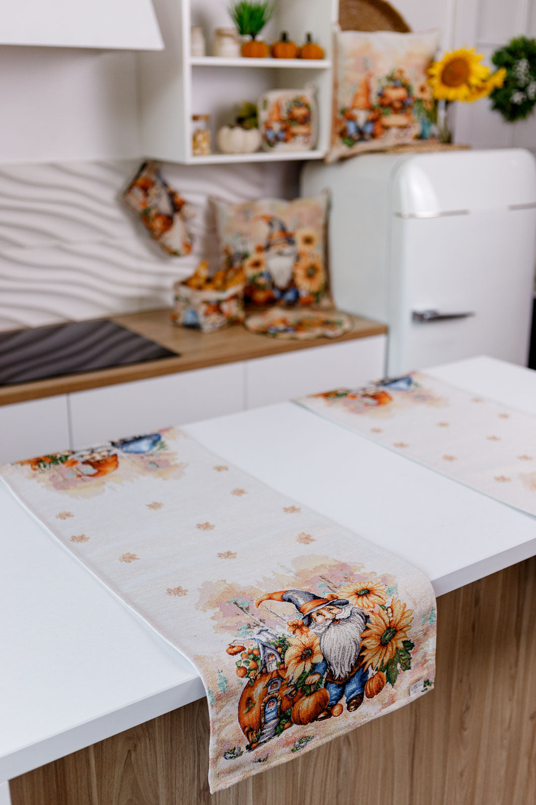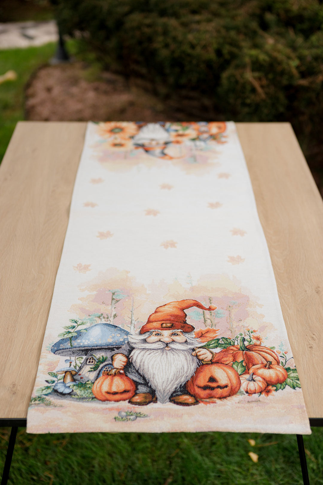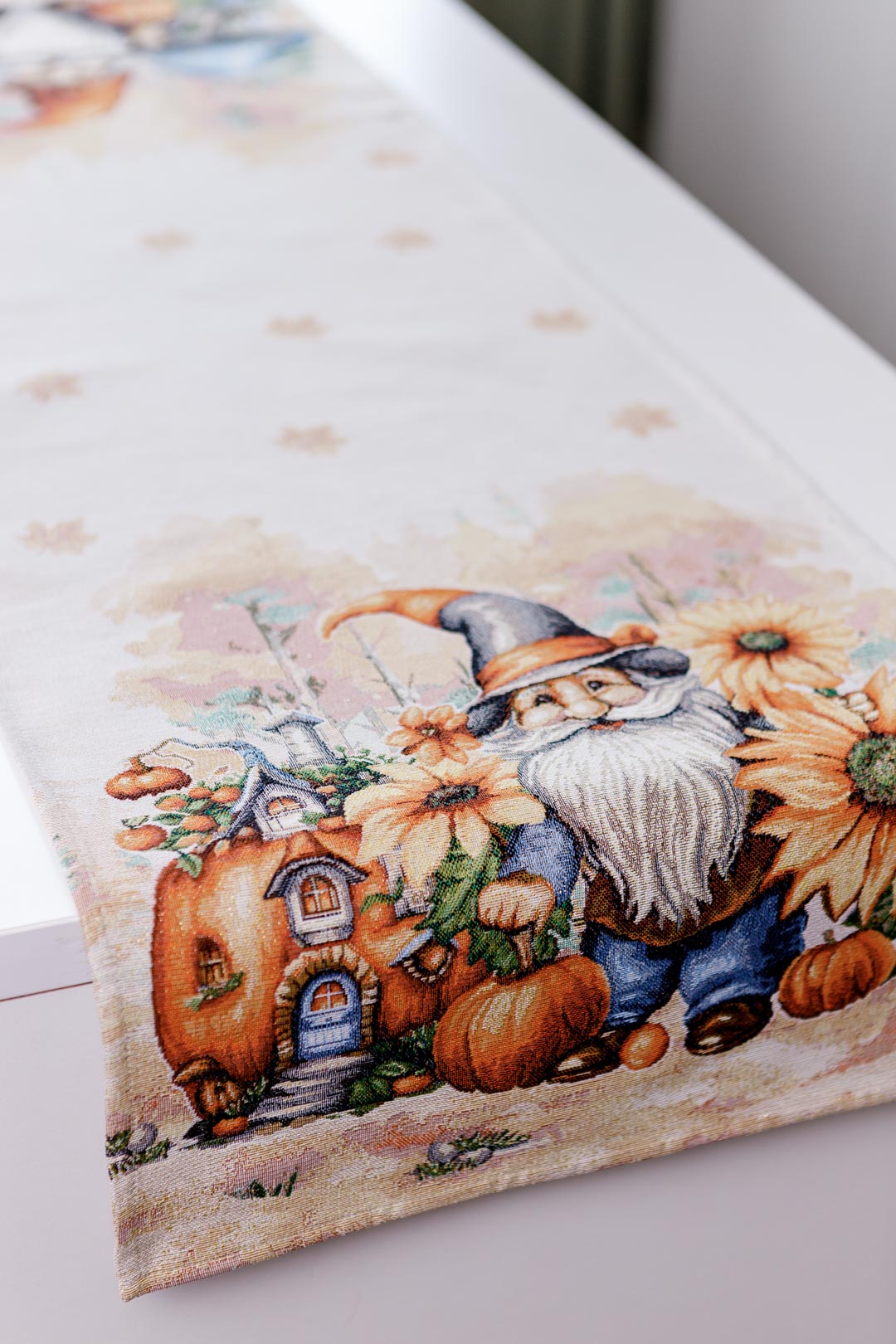 Autumn gnome tapestry table runner will be a great housewarming Halloween gift.