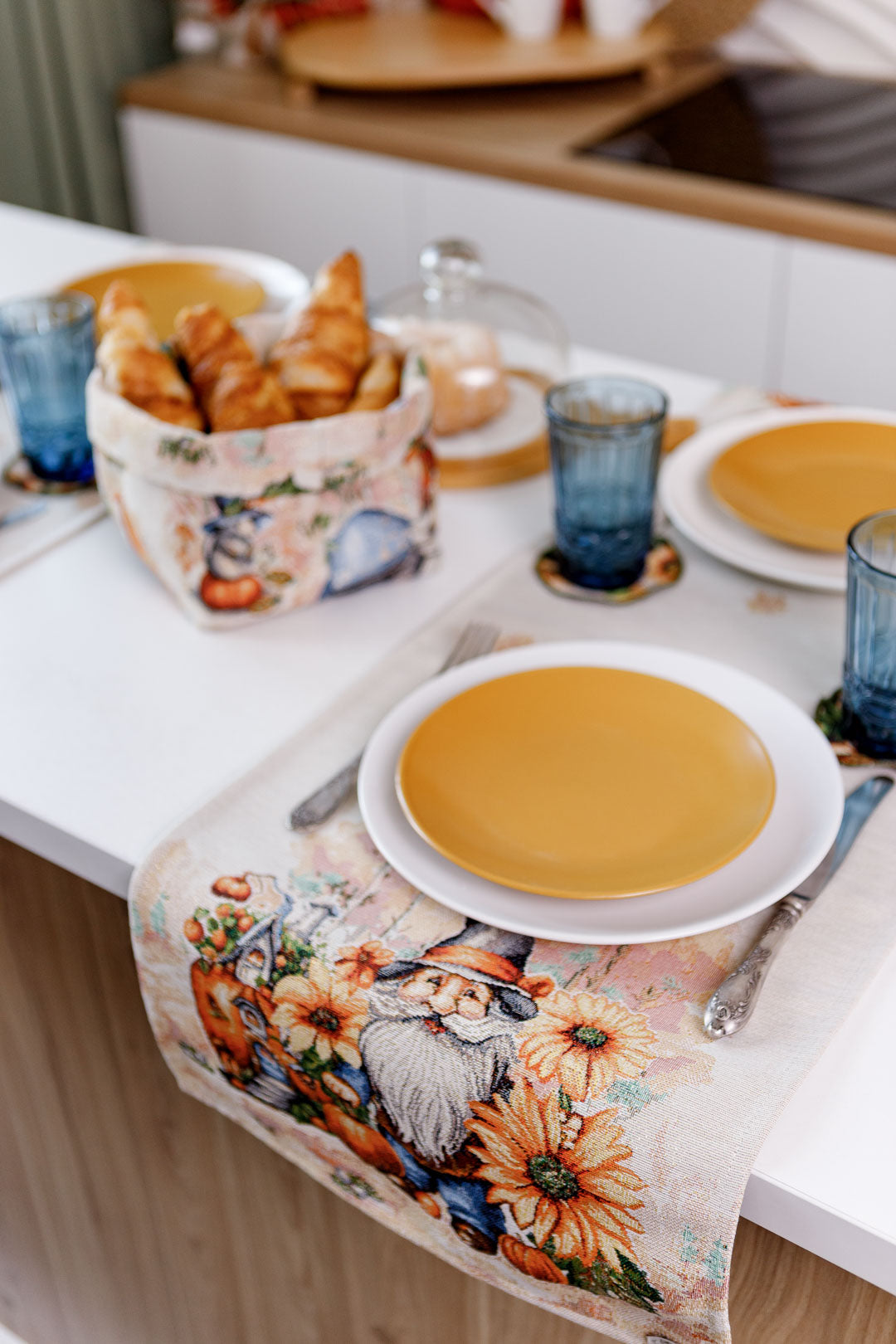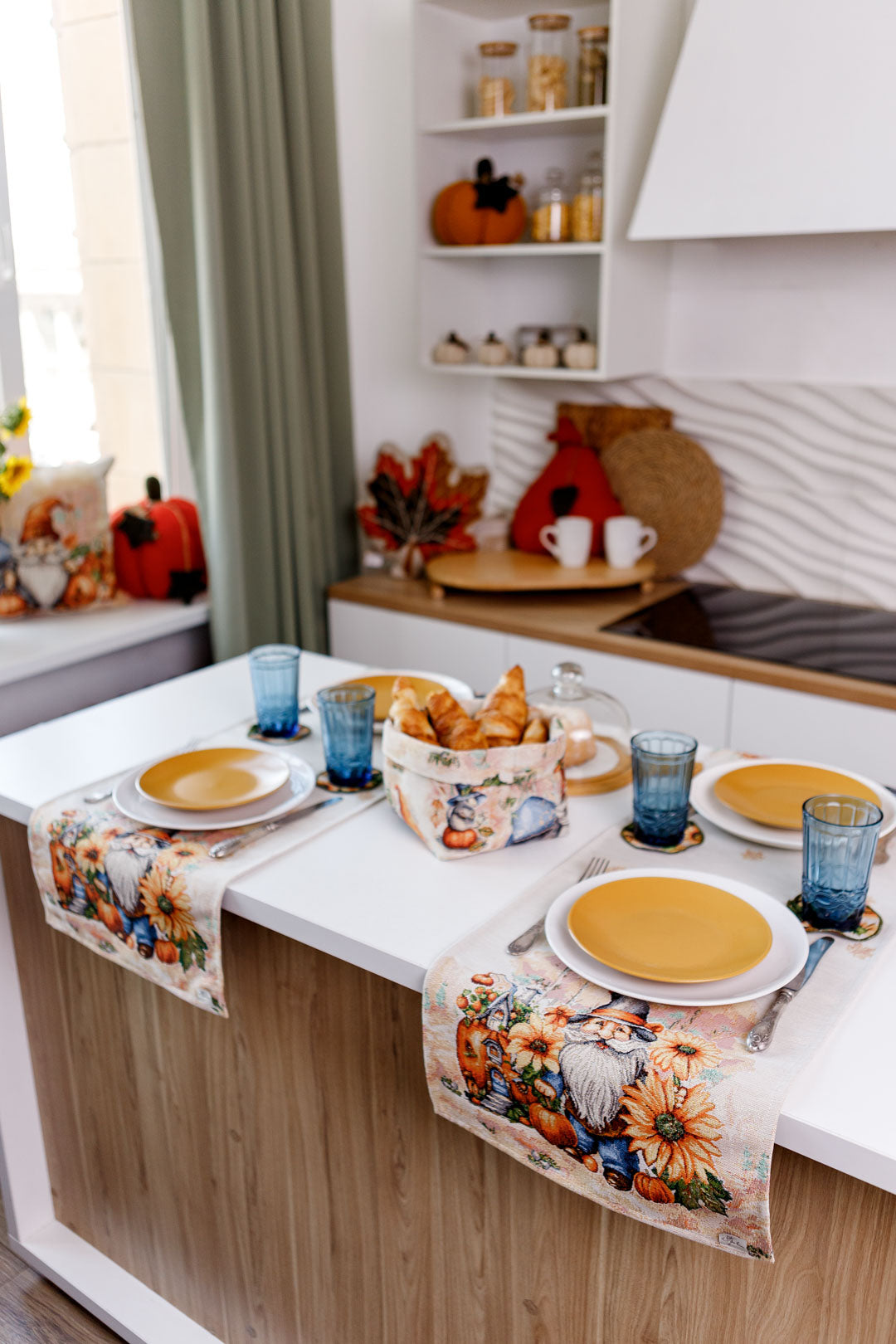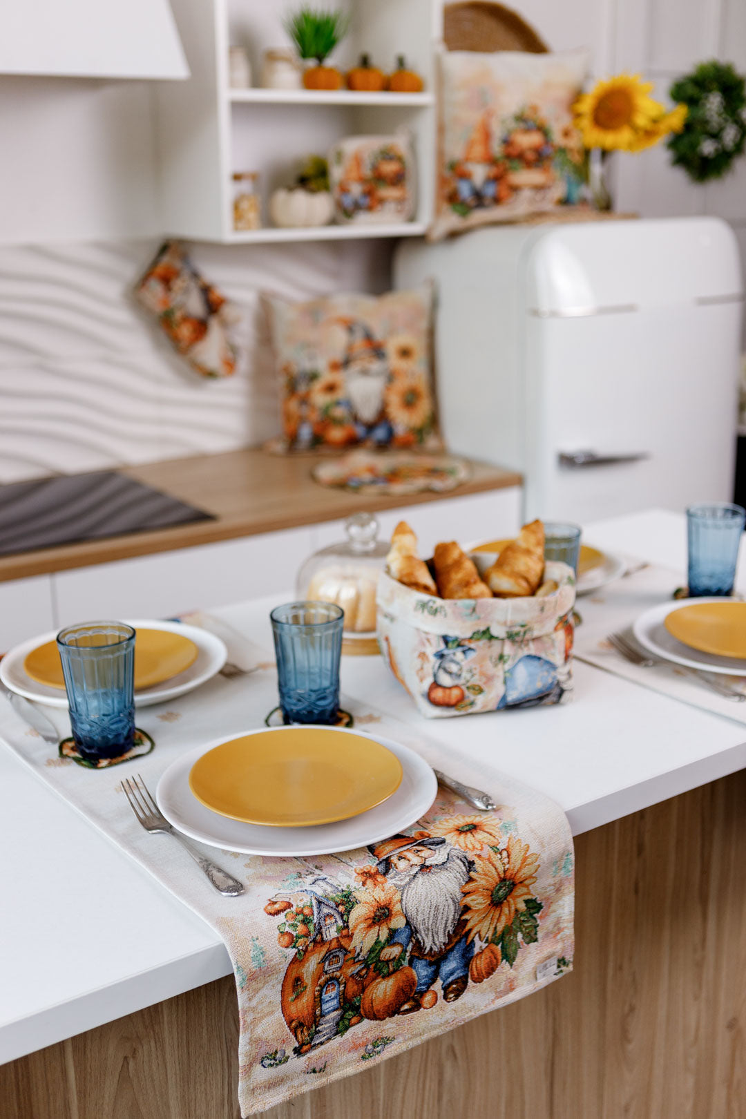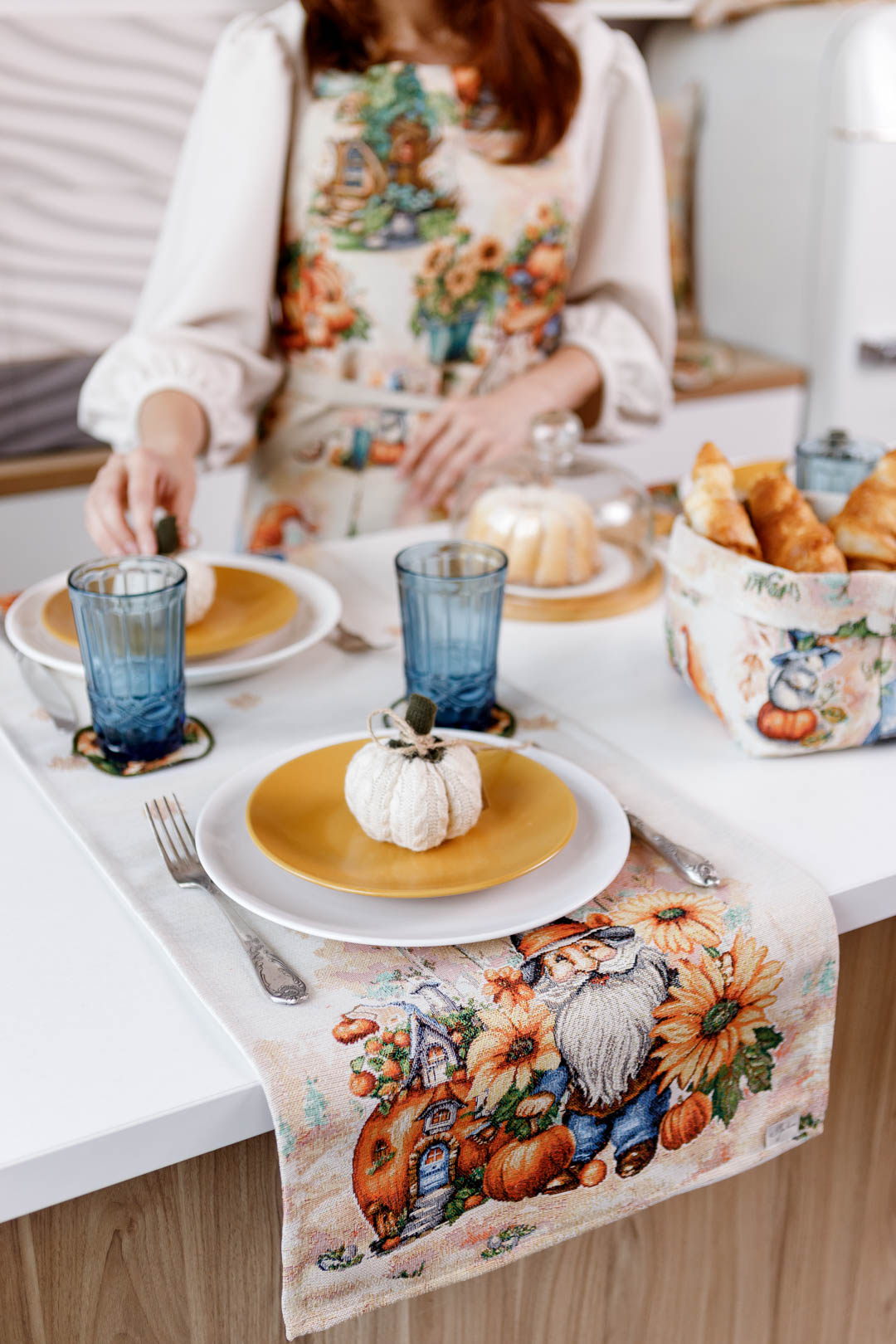 Autumn gnome tapestry table runner will be a great housewarming Halloween gift.