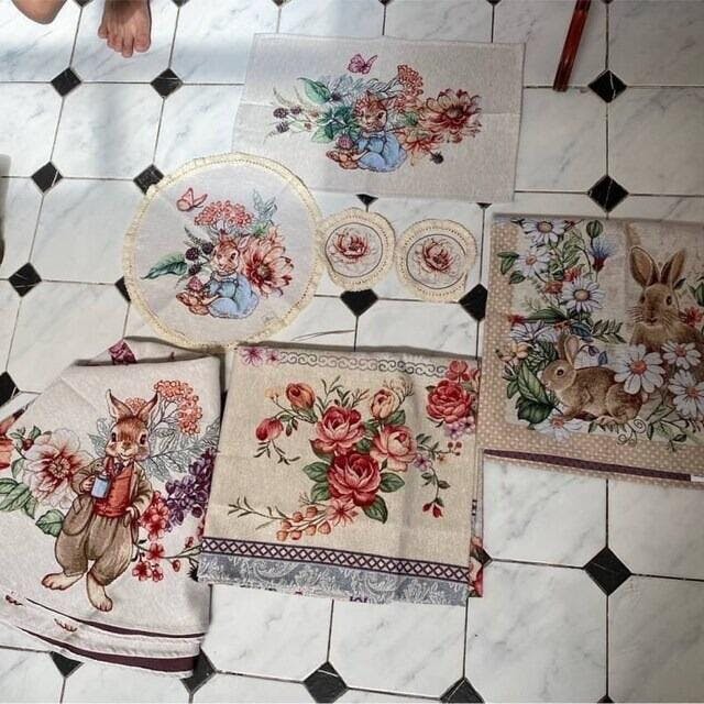 The beige tapestry table runner with rabbits and flowers pattern will decorate a living room or a kitchen.