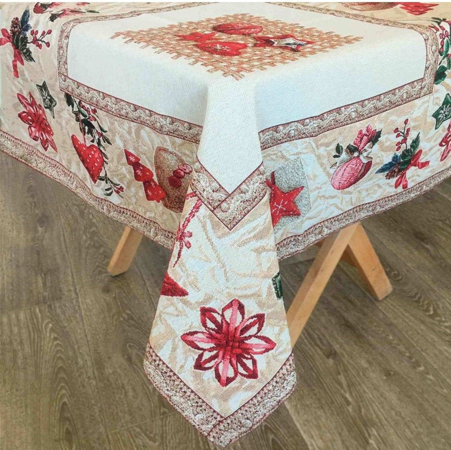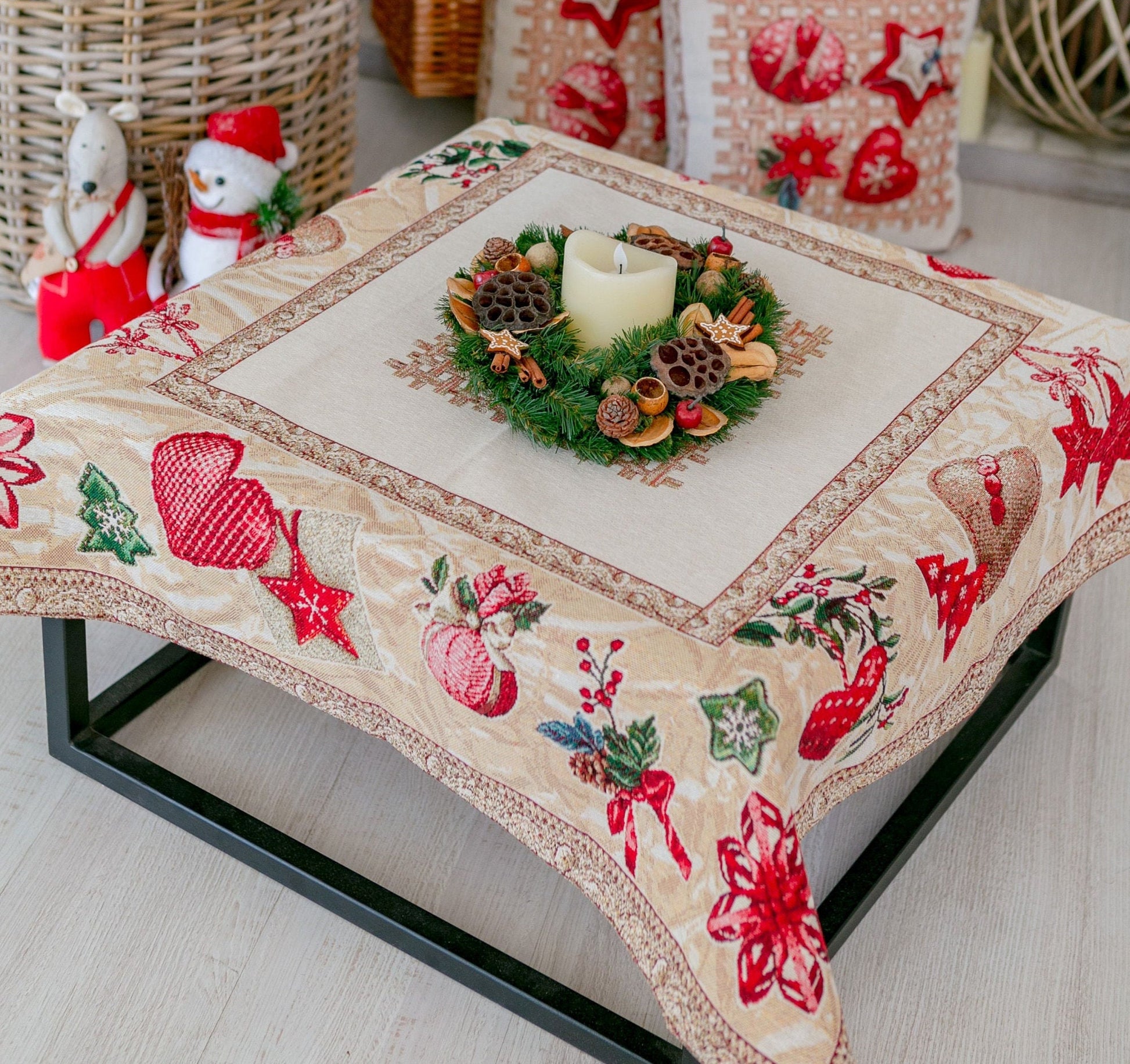 Beige Tapestry Tablecloth With Red Christmas Decorations Pattern | New Year Home Decor, Festive Textile Set, Present Idea For Family, Friends