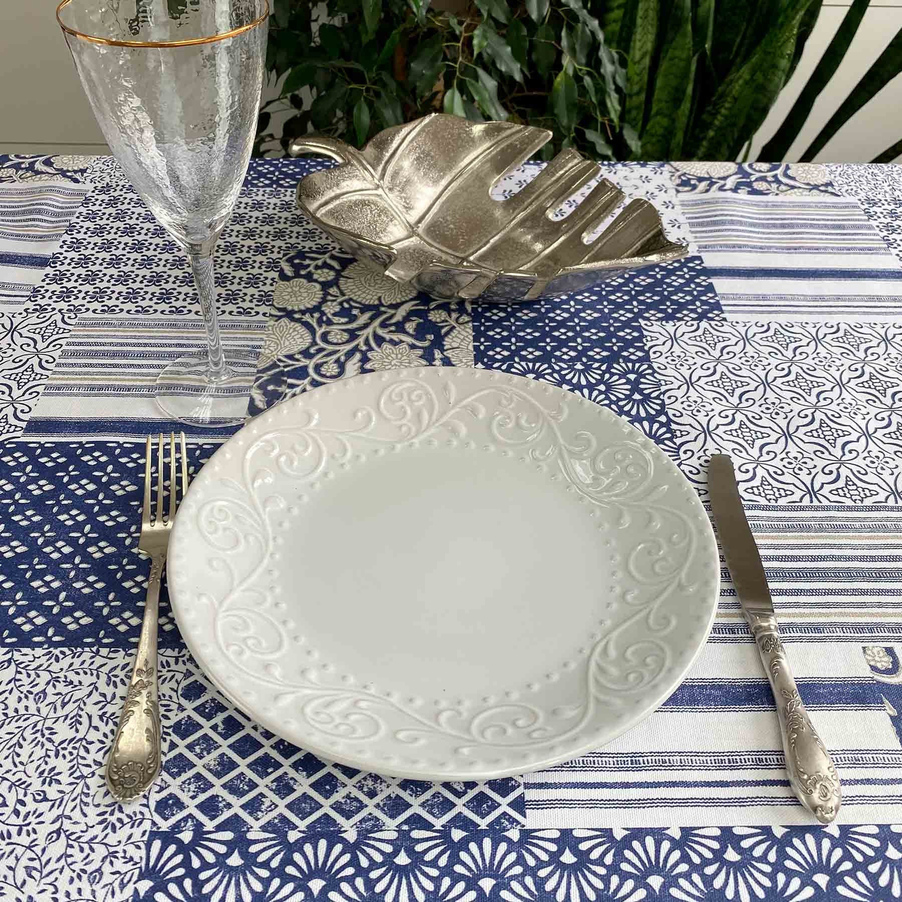 Blue and white water-repellent tablecloth with patchwork and flowers print will be a great housewarming present.