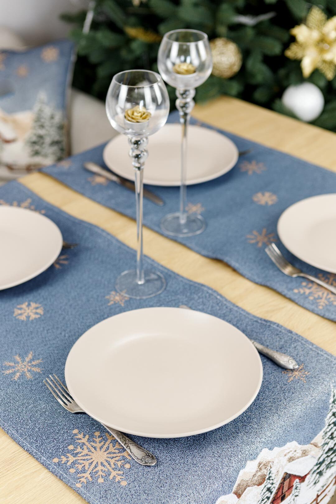 Blue Christmas tapestry table runner with reindeers, golden snowflakes and a hut in winter forest pattern will be a great winter holidays gift.