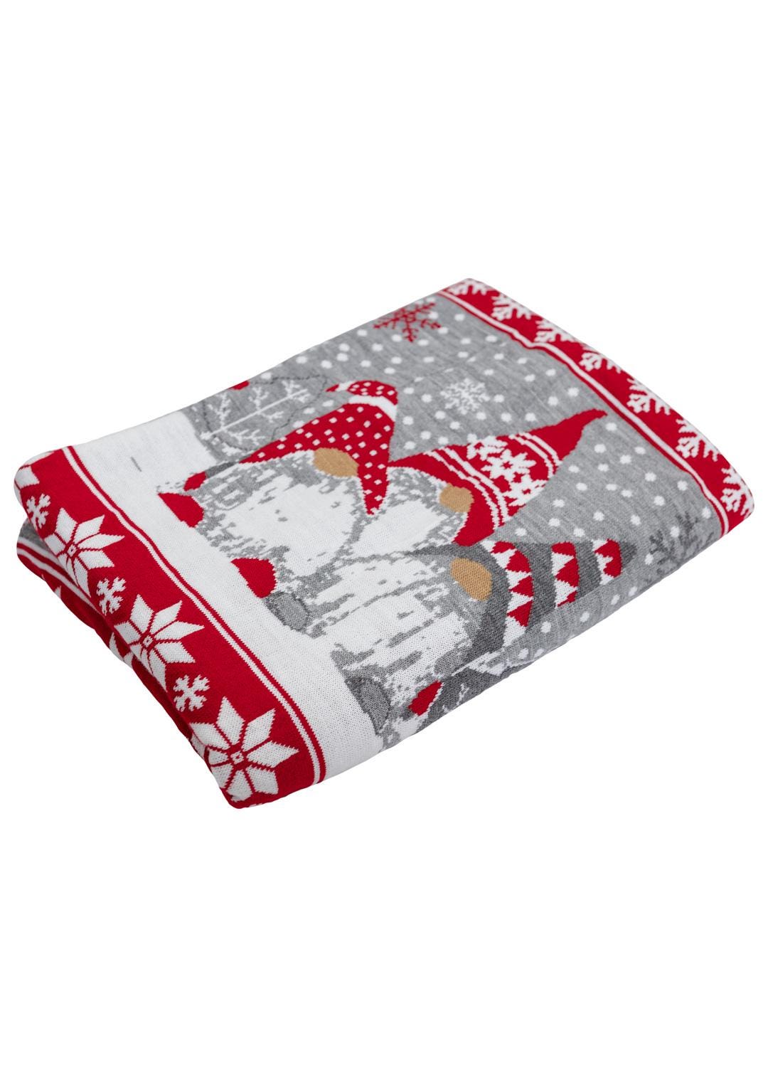 Grey and red knitted pillowcase with tassels, Christmas gnomes pattern will be a great housewarming gift for winter holidays.