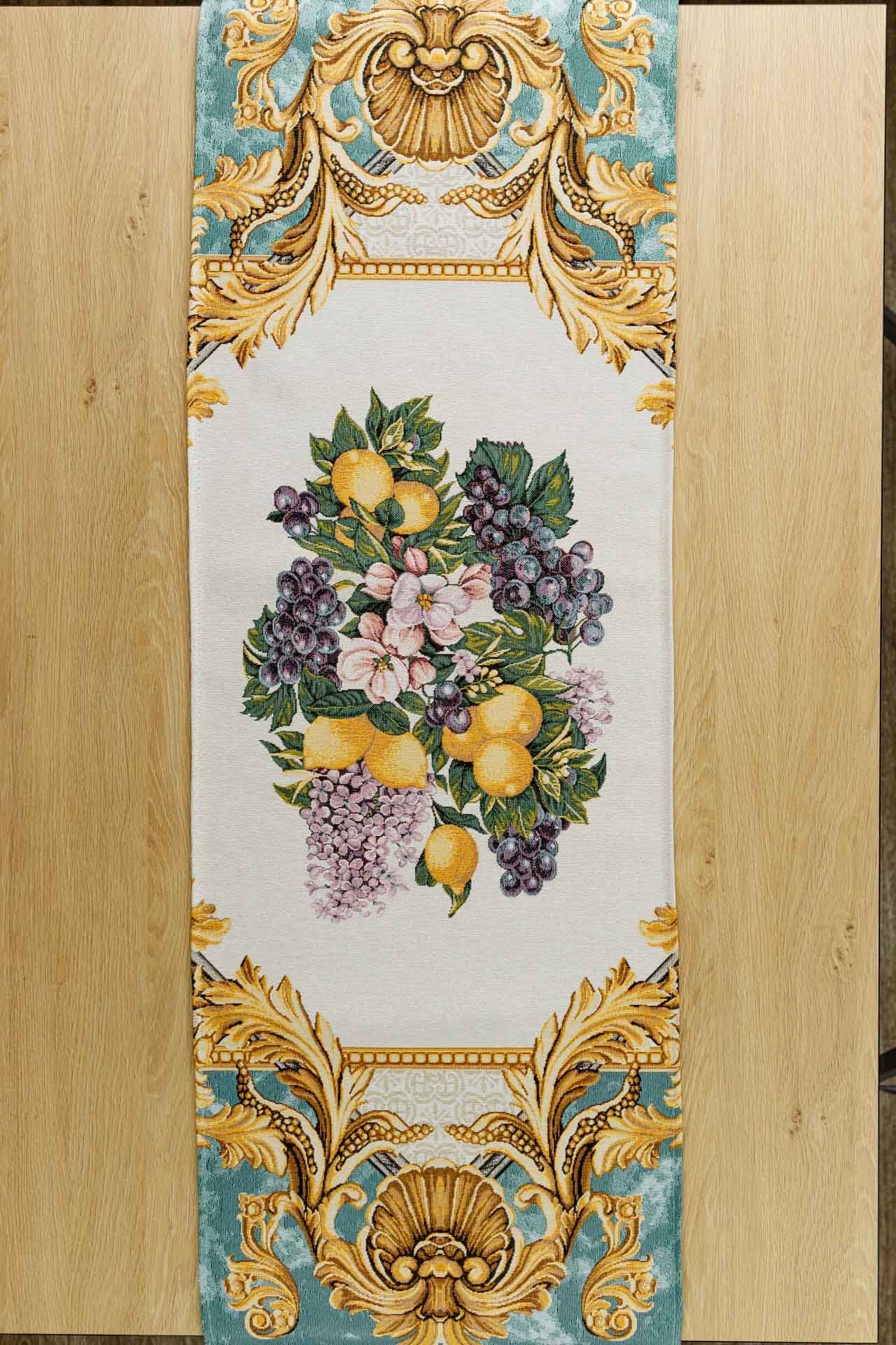 Italian Style Tapestry Table Runner With Lemons, Grapes, Flowers, Gold Monogram Pattern | Luxury Home Decor, Living Room Textile, Gift Idea.