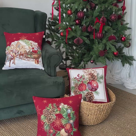 Red Christmas Tapestry Pillowcase – Holiday Wreath with Pinecones & Ornaments