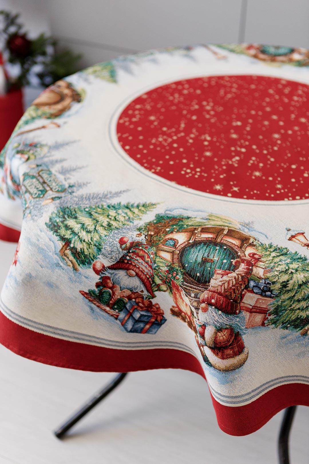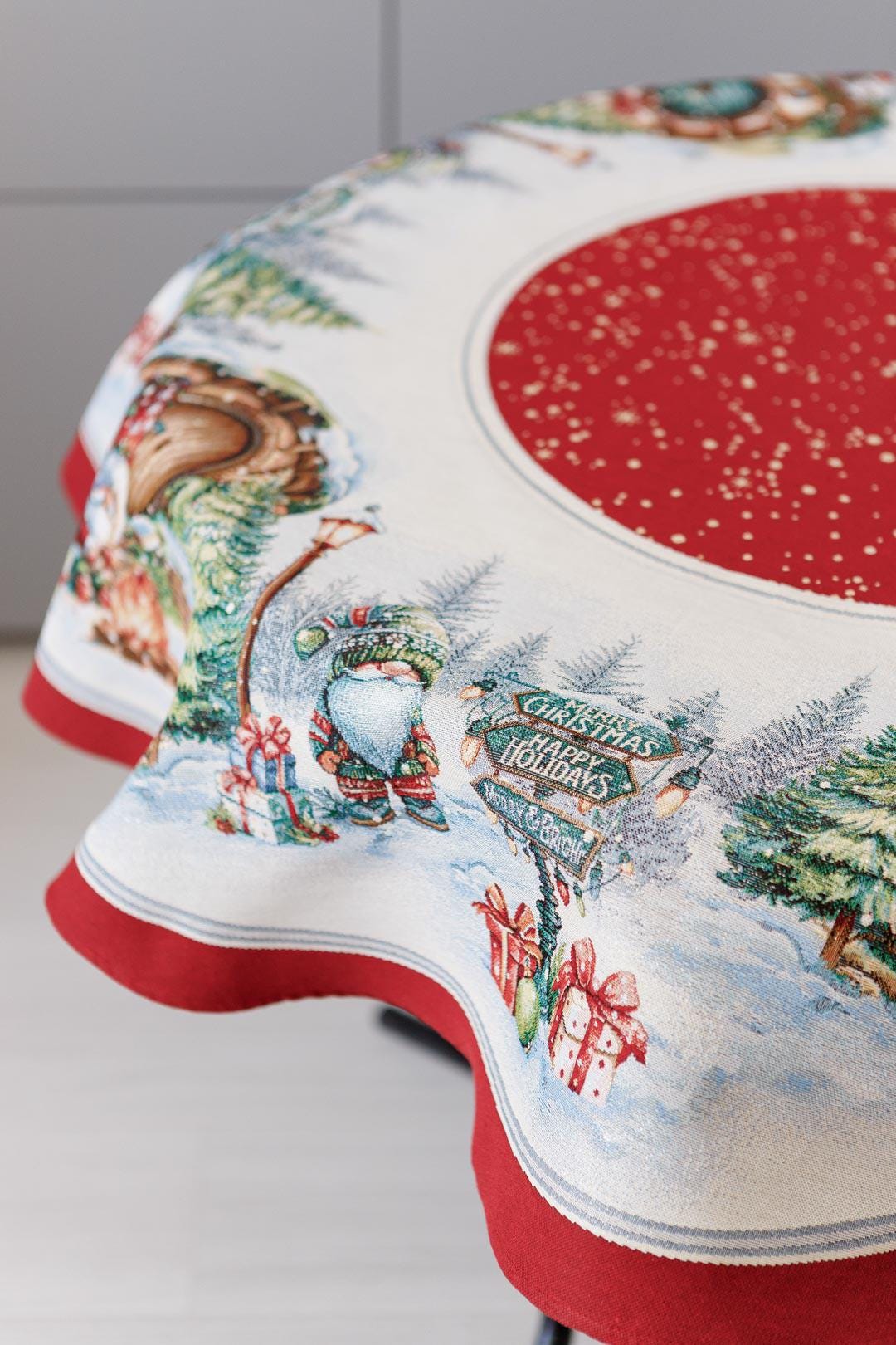 Round red Christmas tapestry tablecloth with Gnomes and presents pattern will be a perfect winter holidays housewarming gift.