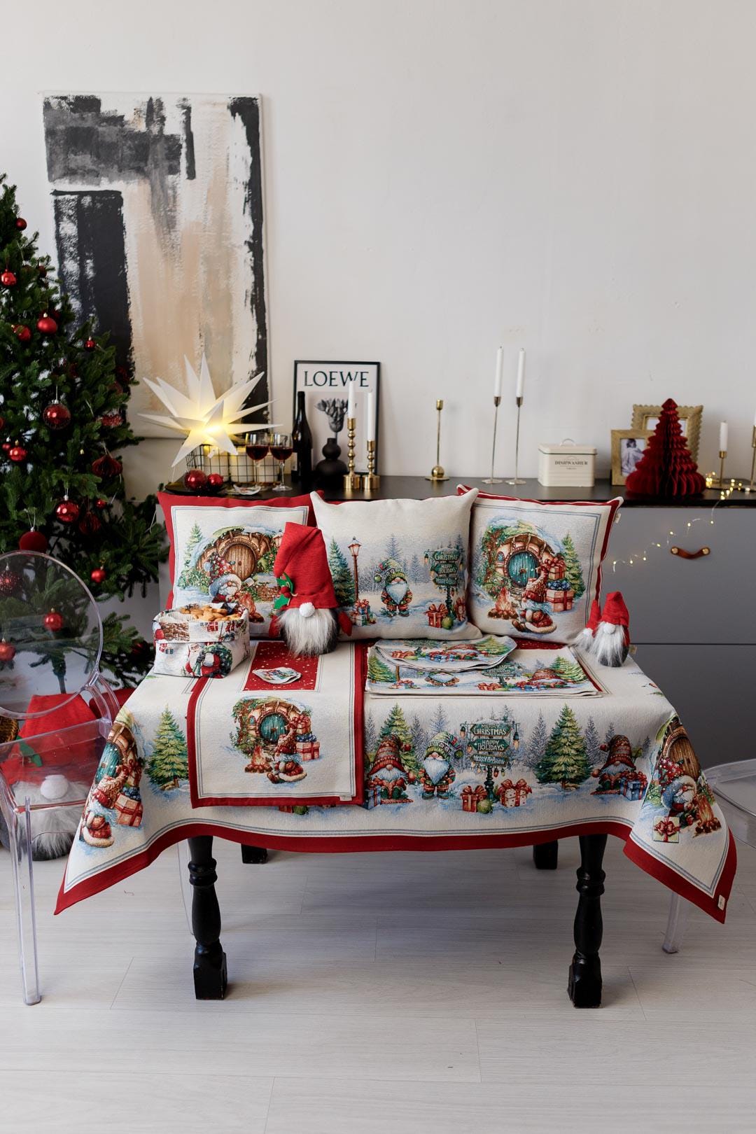 Set of Christmas tapestry kitchen apron, oven mitten, potholder with x-mas gnomes, presents and bonfire pattern will be a great housewarming present.