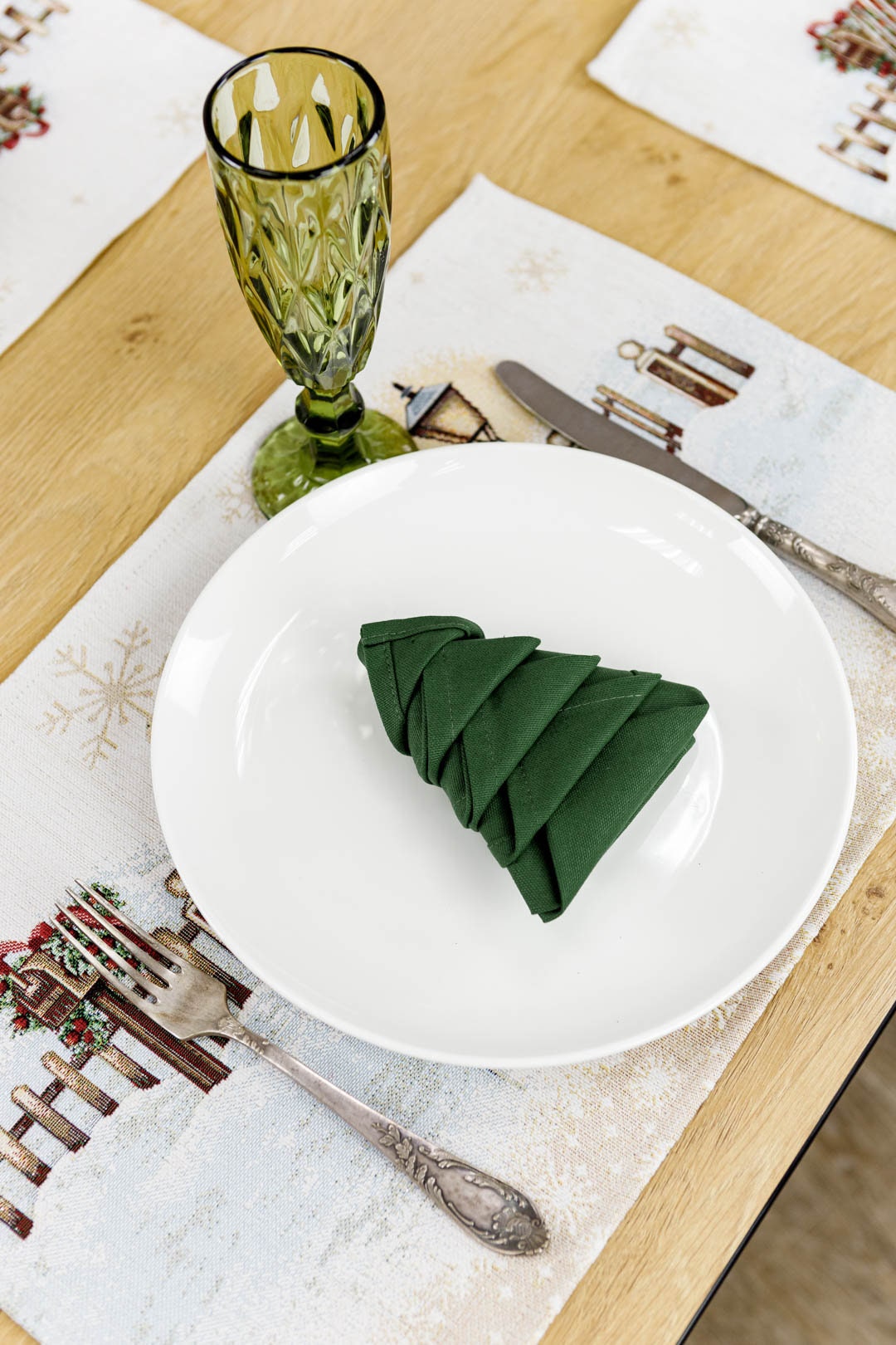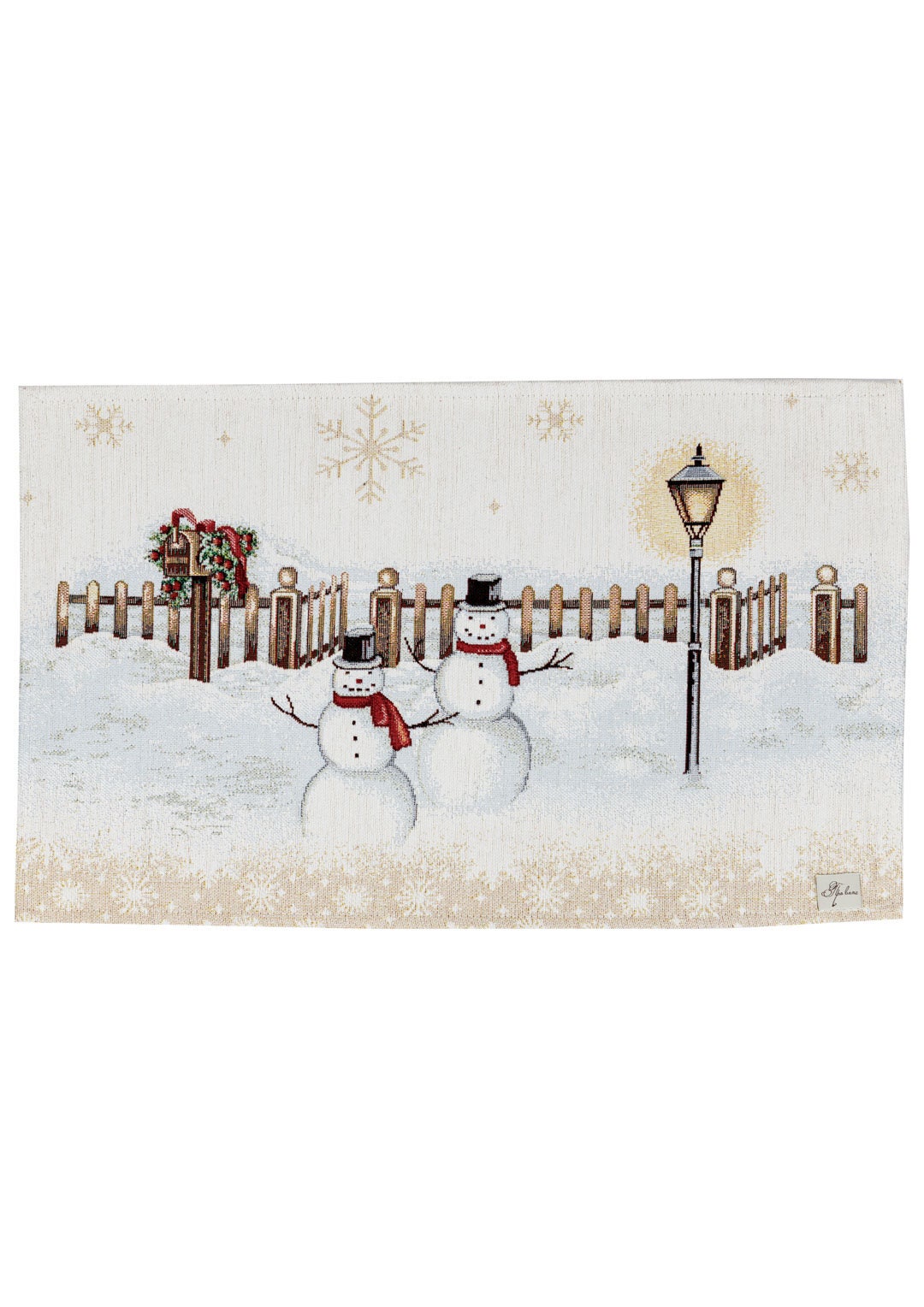 White tapestry Christmas placemat with snowmen and golden snowflakes pattern will be a perfect housewarming gift.