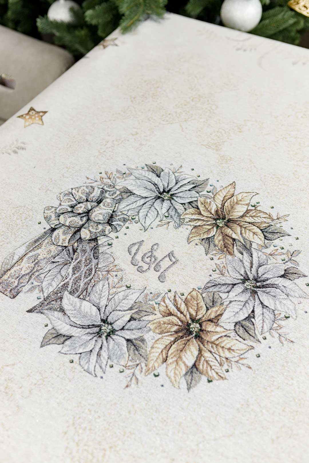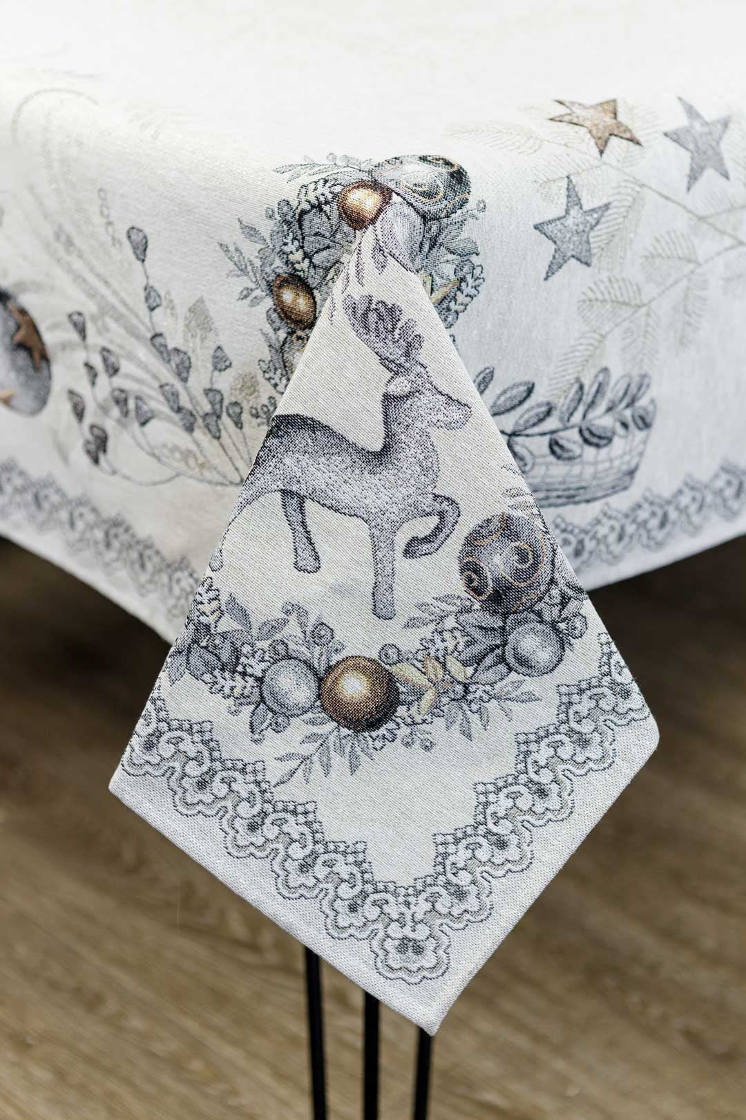 Silver Christmas tapestry tablecloth with reindeers and x-mas decorations pattern will be a great winter holidays gift.