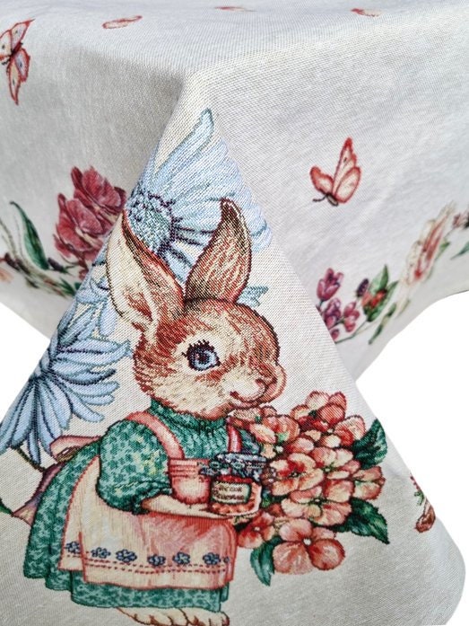 Tapestry tablecloth with rabbits family and flowers print will be a perfect holiday textile decor.