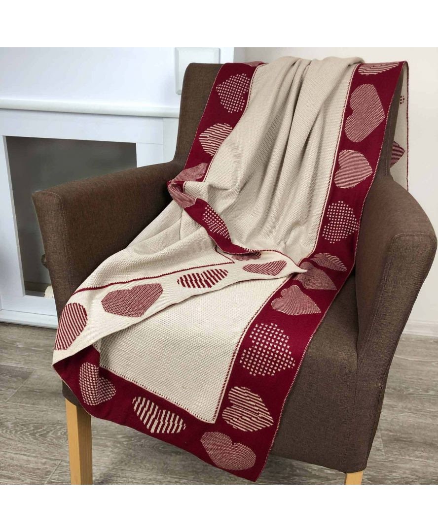 Two-Sided Beige And Red Knitted Blanket With Hearts Pattern | Present Idea, Festive Home Textile, Living Room Decor