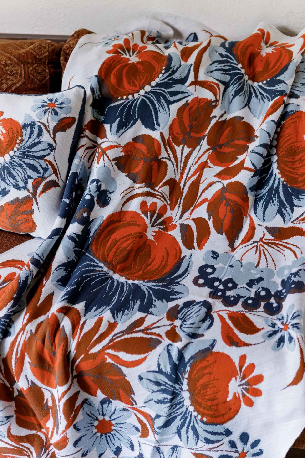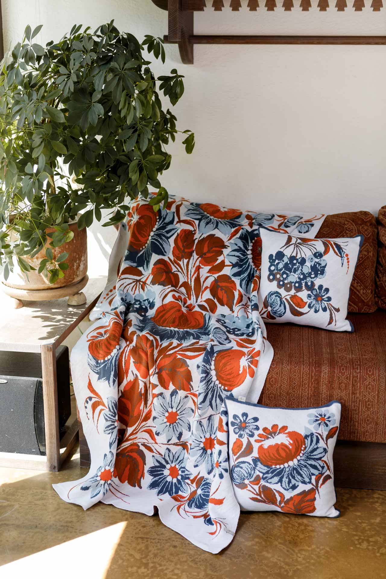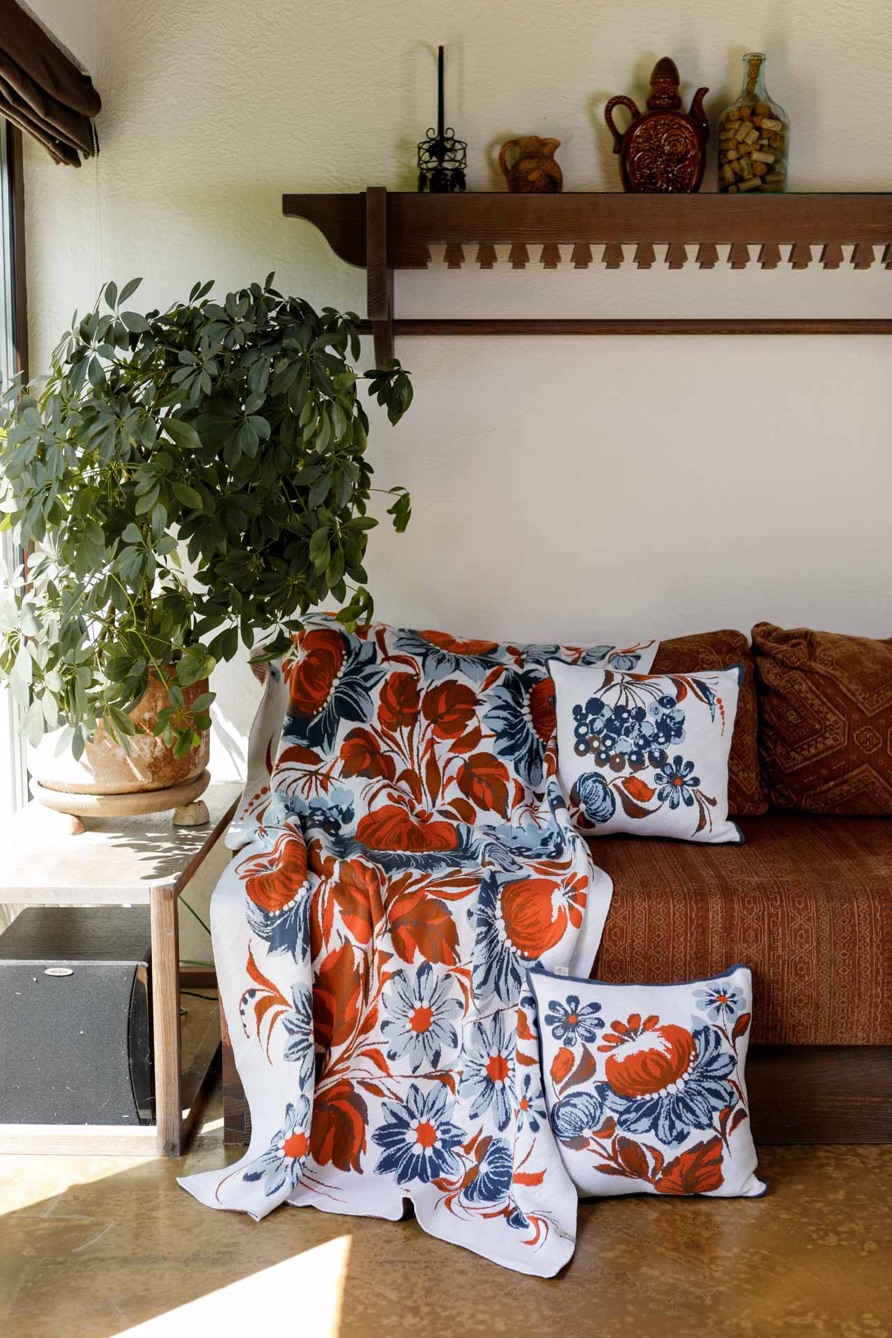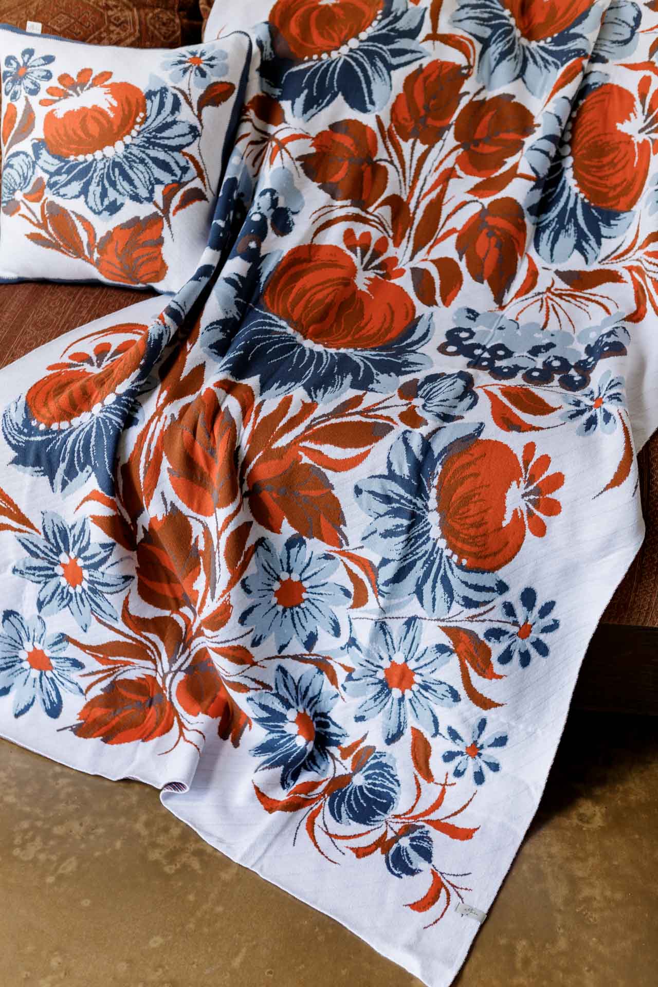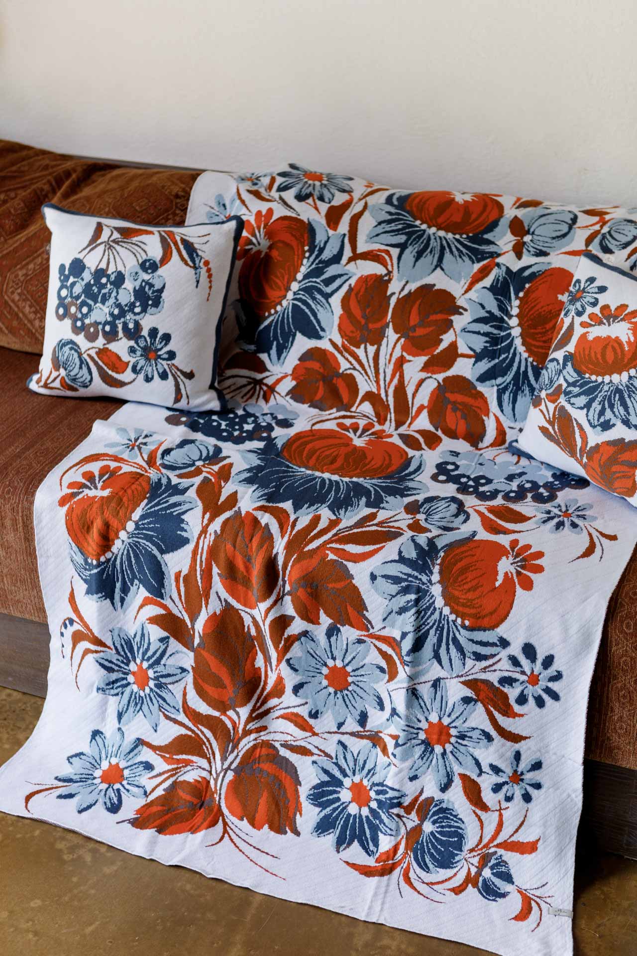 Ukrainian Style Knitted Throw Blanket, Petrykivka Floral Motif, Sofa Cover, Rustic Farmhouse Home Decor, Pillowcases With Bedspread Set