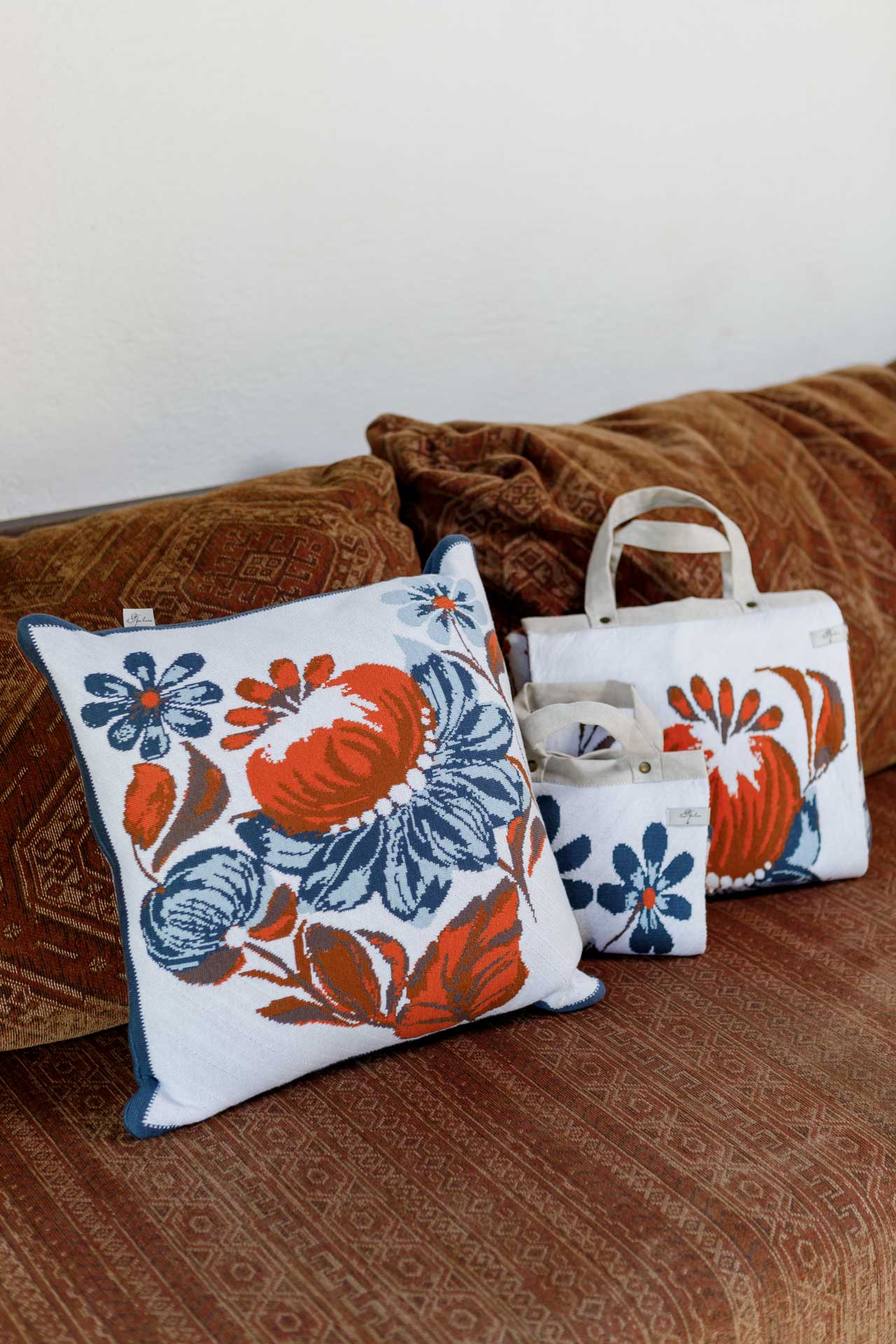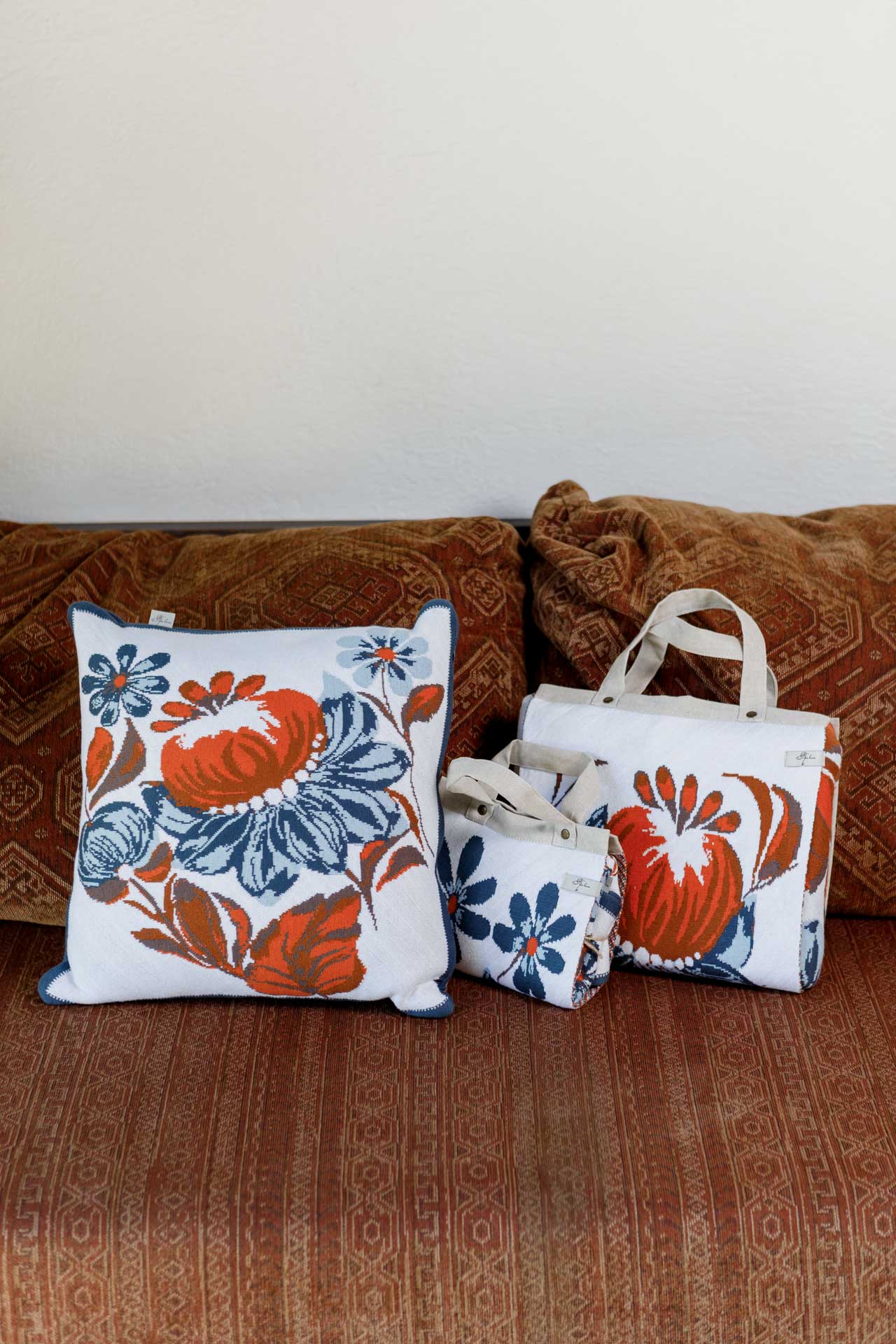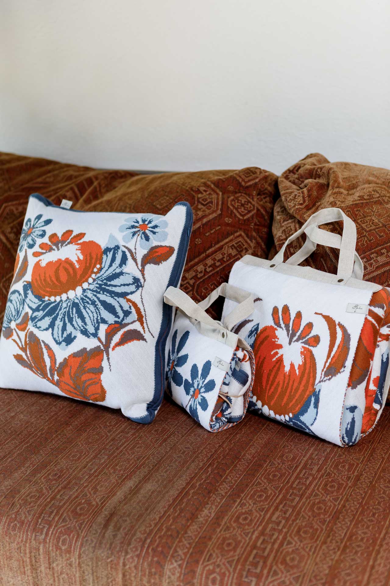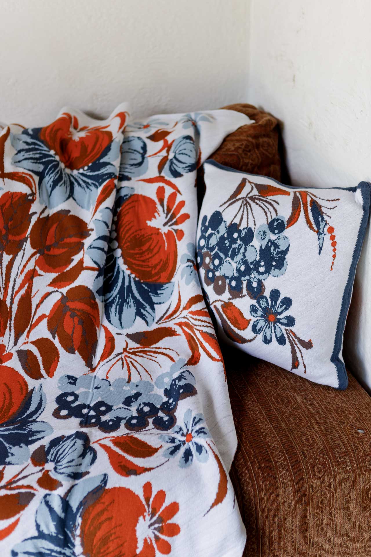 Ukrainian Style Knitted Throw Blanket, Petrykivka Floral Motif, Sofa Cover, Rustic Farmhouse Home Decor, Pillowcases With Bedspread Set