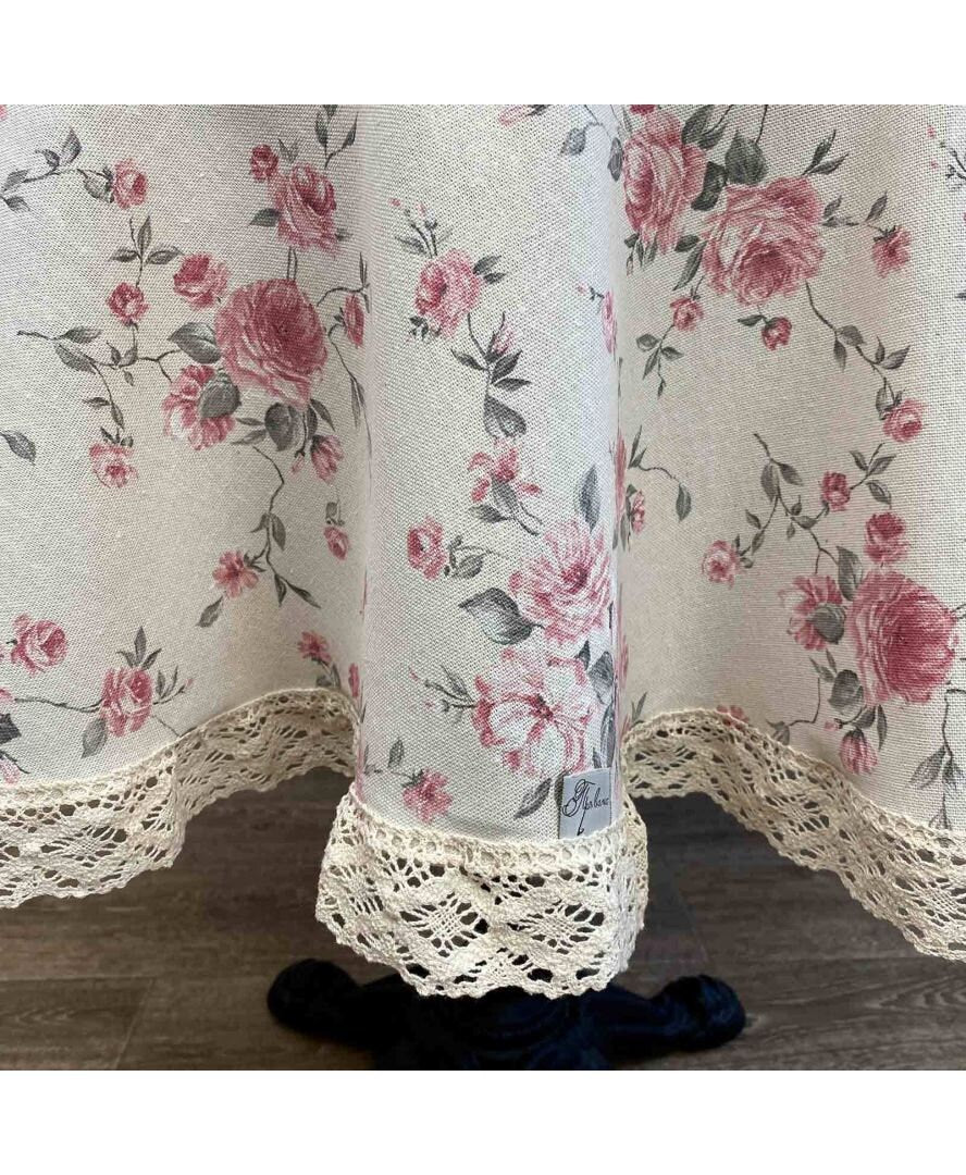 White cotton table runner with pink roses print and lace edging is a great housewarming present idea.