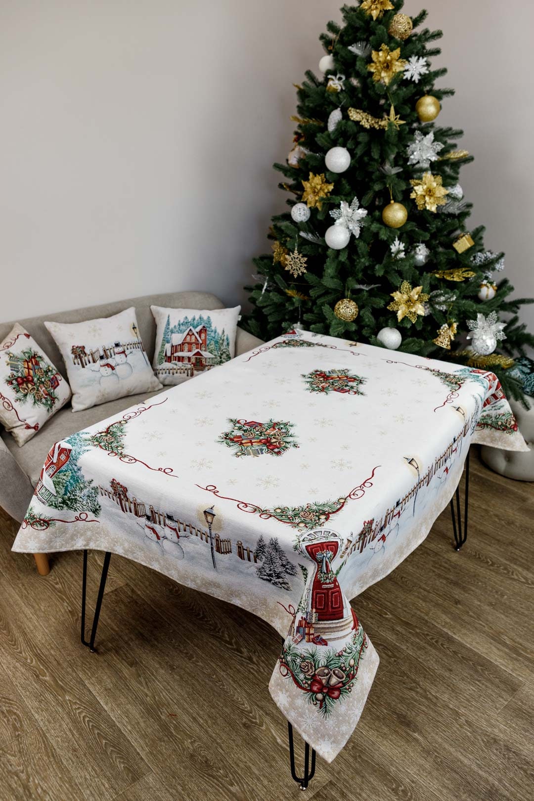White tapestry and velours tablecloth with snowmen and Christmas wreath pattern will be a perfect housewarming gift.